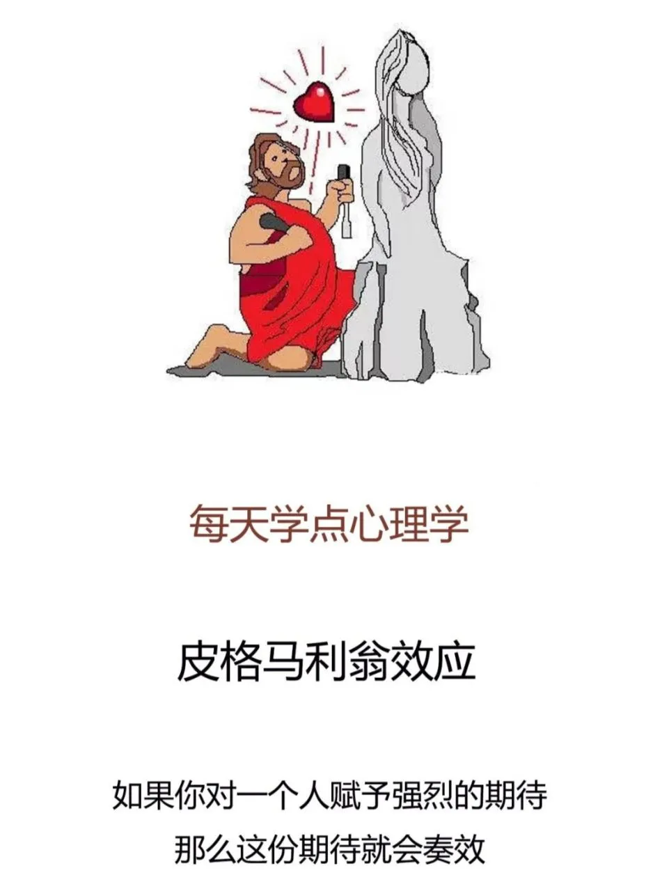 又称罗森塔尔效应,通常指一个人对另一个人行为的期望成为自我实现的预言的现象。最早由罗伯特·罗森塔尔与伊迪丝·雅各布森正式提出。他们在实验中从班级中随机挑选部分学生,告诉教师这些学生拥有过人的智力水平,极具发展潜能,但要对其他人保密。一段时间后发现这些被随机选中的学生成绩进步很大,且变得十分自信积极。总结来说,是教师对学生形成的期望会使学生的学习成绩和行为表现向符合该期望的方向发展。这一效应启示我们,如果你对他人有所期待,可以通过以真诚的态度对待对方,给予其由衷的赞赏,从而调动其积极性,促使其朝着自己所期望的方向发展,这份期待或许就会成真。
